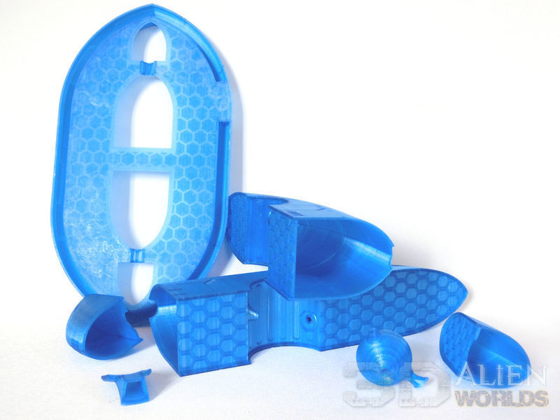 £ Here's the finished and assembled model, which towers 27cm (11") high. It is 30cm x 16cm (12" x 6.5") large at the base. It's hard to see the sculpted detail with this clear blue filament, but there are some lines and alien text dotted around the model. These will be much clearer on the painted version!