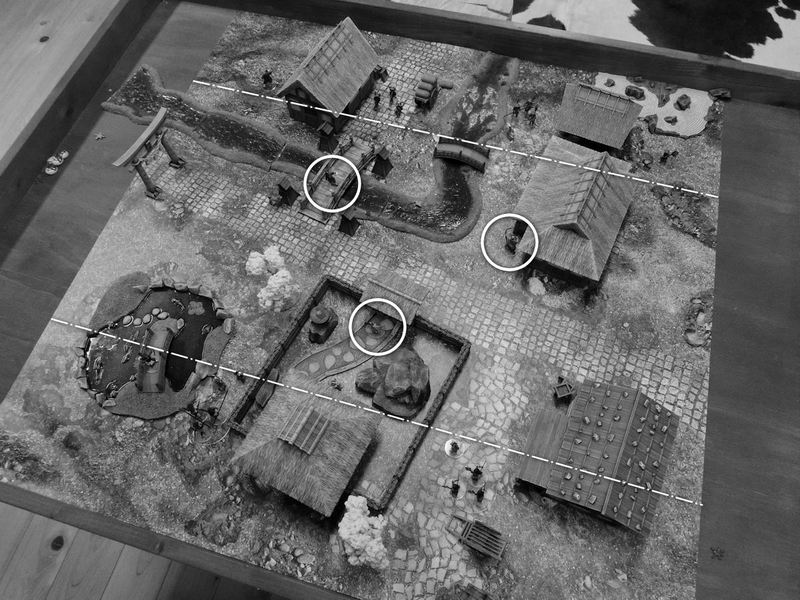 £ In this black and white photo you can see the 3 possible locations of the spy. Is the spy a simple watchman standing on the bridge (left circle), a suspicious-looking geisha outside the teahouse (centre circle) or the lowly priest standing outside the farmhouse (right circle)?