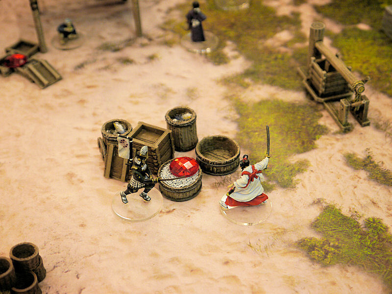 ▲ Lady Reiko sprints forward to the central objective, to prevent Lord Nobu's samurai from searching the buckets and boxes there.
