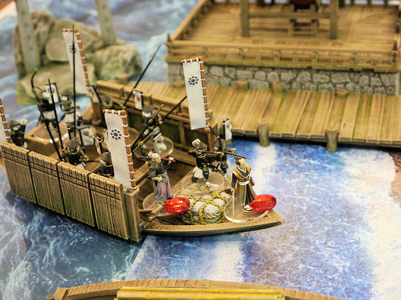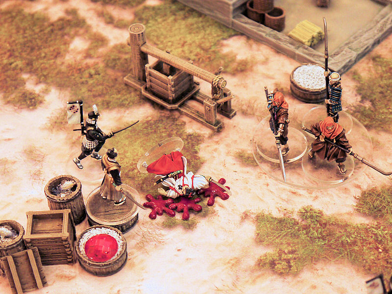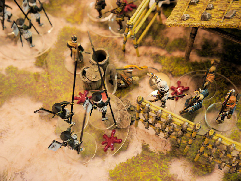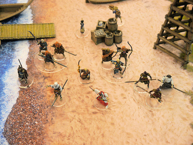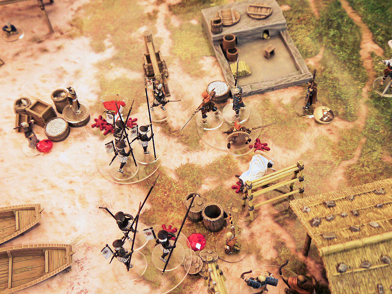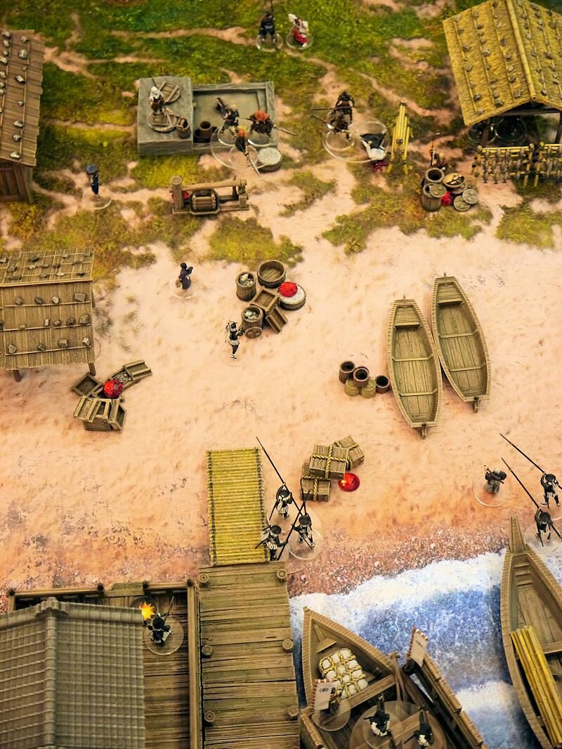 ▲ Lord Nobu's forces rush off their boats and onto the beach, as Lady Reiko's village defenders hurry to assemble a response. One of Lord Nobu's samurai lieutenants speeds forward to seize the central objective, while his musketman opens fire from the drum platform and blasts one of the female bodyguards. First blood to Lord Nobu!
