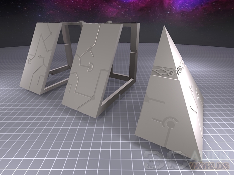 A large 29-piece modular set which can be combined to create a variety of Necron-inspired pyramids. Each piece is approximately 100mm high, and can create 3 level pyramids with a table footprint of 360mm x 360mm (300mm tall), or even a massive 5 level mega-pyramid with a huge table footprint of 600mm x 600mm (500mm tall). Many pieces can be interchanged to create a huge variety of pyramids to suit your tastes.