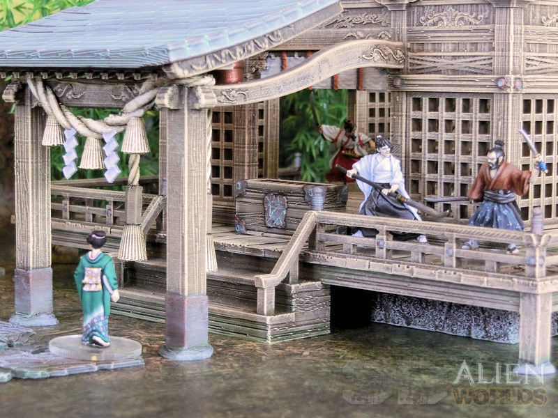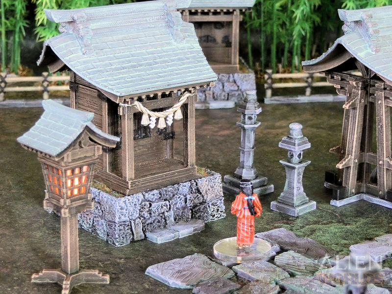A set of shrine buildings and accessories from old Japan. This set contains enough items to make a good-sized and fully-themed battlefield on its own!